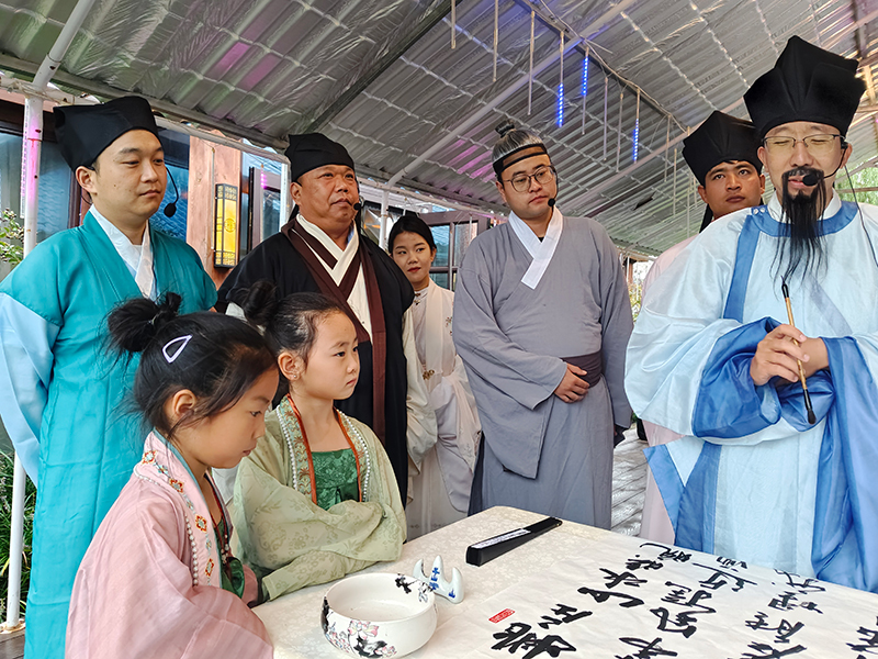短剧的名称定为《苏轼游姚庄》。据县志记载,北宋大诗人苏轼遭贬时,南下途径万里茶道的重要节点姚庄三郎庙,留下了脍炙人口的美好传说。因此,剧本创作紧扣苏轼并大胆用穿越笔法写出了“苏轼问史,苏轼问茶,苏轼问景”三点一线三幕一体的历史超越情景短剧剧本。在演出问题上,雷巍提出了“群众性、低成本,可持续”的要求,参演的6名主演和10名群演全部由乡村两级干部和部分爱好文艺的农民群众担任,经过“对词,走台,彩排”三步走的紧张培训,大家很快进入了角色,于9月25日实现了全流程彩排的成功演出,并将于“十一”期间向广大游客正式演出。